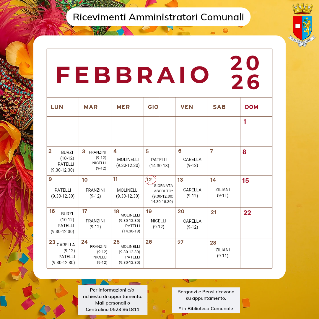Si pubblicano le giornate di ricevimento degli Amministratori per il mese di febbraio 2026